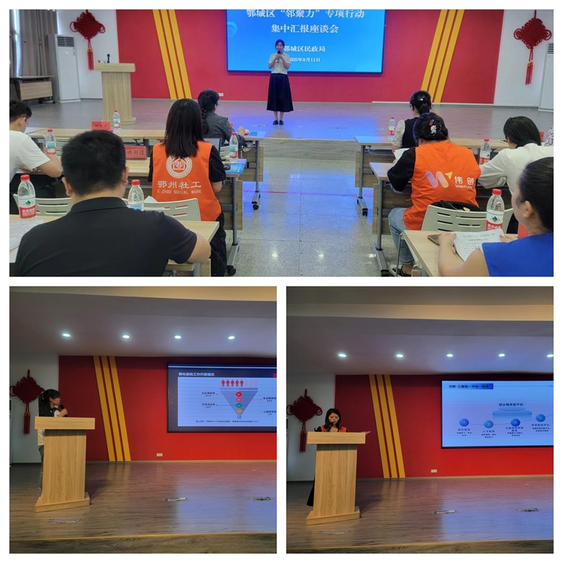 9月11日下午,鄂城区“邻聚力”专项行动集中汇报座谈会在滨湖社区九楼会议室举行。市民政局社会组织管理科副科长刘梦诗、区民政局党组成员、副局长李美珍,及市社会组织孵化基地、各镇(街)民政办、社会组织孵化基地、联合会负责人,6个试点村(社区)书记齐聚一堂,共同复盘工作成效、校准后续推进路径。