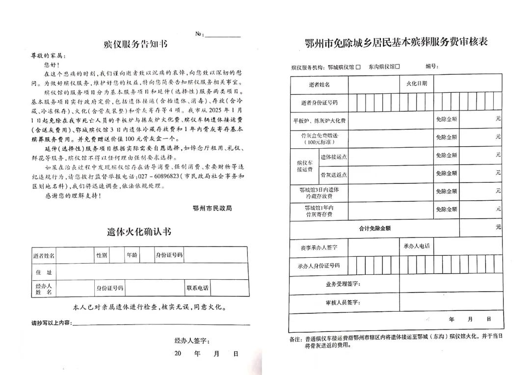 (二)鄂州市内殡仪馆自存放日起1年骨灰寄存费(100元/具)。